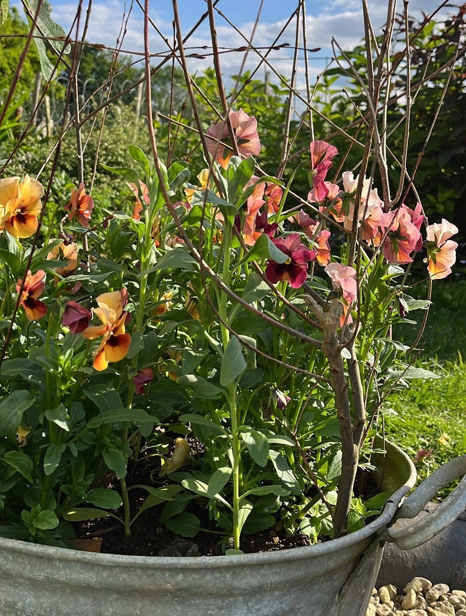 I have some pansies that I started in the autumn, which desperately need to get planted out. I grow these with the intention of getting the stems tall enough to cut for bouquets. I only find this possible if they’re sown in the autumn and you pick the right varieties for the job.